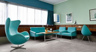 Alt på hotellet var gennemsyret af Arne Jacobsens øje for moderne og elegant design! De ikoniske stole, Svanen og Ægget, blev designet specielt til hotellets foyer og skulle stå som det bløde modstykke til den kantede arkitektur på bygningen. Den gennemførte stil blev ført ud til fulde og selv bestik, dørhåndtag og tapet var Arne Jacobsens design.