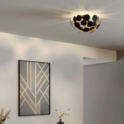 Kinan Loftlampe Black/Gold fra Lindby er et dynamisk festfyrværkeri i dit loft, der med garanti vil fange dine gæsters opmærksomhed. Lampen har et finurligt design en base og en række overlappende plastplader med et matsort finish og en guld farvet inderside, der giver lampen et stilrent og moderne udtryk, som giver et eksklusivt touch til ethvert rum. De overlappende plader og den guldfarvede inderside gør, at lyset spreder et smukt og dynamisk lysspil langs loftet. Samtidig har den lune glød en varm og hyggelig effekt i rummet, som gør, at lampen er ideel til at have hængende i soveværet, i entréen eller i stuen, hvor du og dine gæster kan nyde godt af det flotte lys og den behagelige atmosfære.