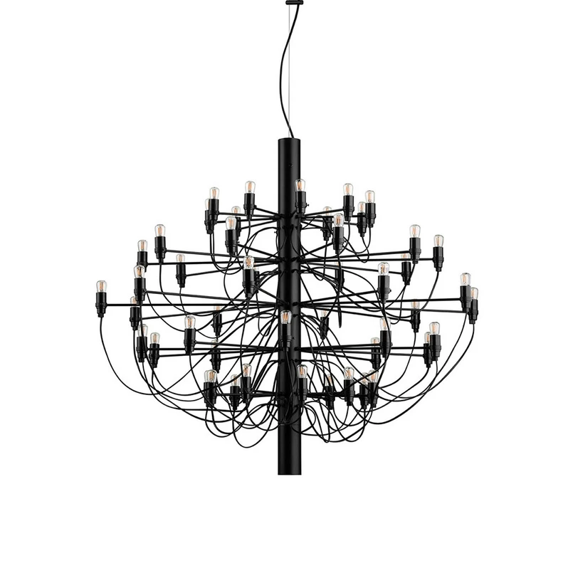2097/50 LED Pendel Sort er en karakteristisk og utrolig smuk lysekrone. De elegante arme og simple cylindriske former giver lampen en industriel æstetik. I stedet for at skjule ledningerne, er de et væsentligt element i designet og giver en blød og organisk karakter til lampen. I messing eller krom, passer den iøjefaldende lysekrone let ind i den skandinaviske stil.