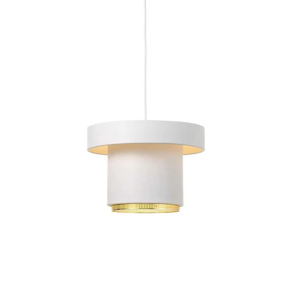 A201 Pendel White/Brass blev designet af arkitekten Alvar Aalto, der oprindeligt designede lampen til Rådhusbiblioteket i Säynätsalo, Finland. Den cylinderformede skærm, har en øvre skygge der giver fornemmelsen af en glorie – typisk for Altos design. Lampen har en skulpturel udstråling, der er smuk uanset om den er tændt eller slukket.