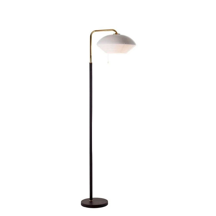 A811 Gulvlampe Polished Brass blev designet af Alvar Aalto i 1965 og var derved den sidste tilføjelse til hans sortiment af gulvlamper. Den hånddrejede stålskærm har en bund af metal-lameller, der skjuler lyskilden og sikrer at lyset ikke blænder. Den hvidmalede skærm, reflektere lyset i den øvre skærm og kaster et diffust og nedadgående lys gennem lamellernes mellemrum. Perfekt som stemningsfuld belysning ved sofagruppen eller din favorit lænestol.