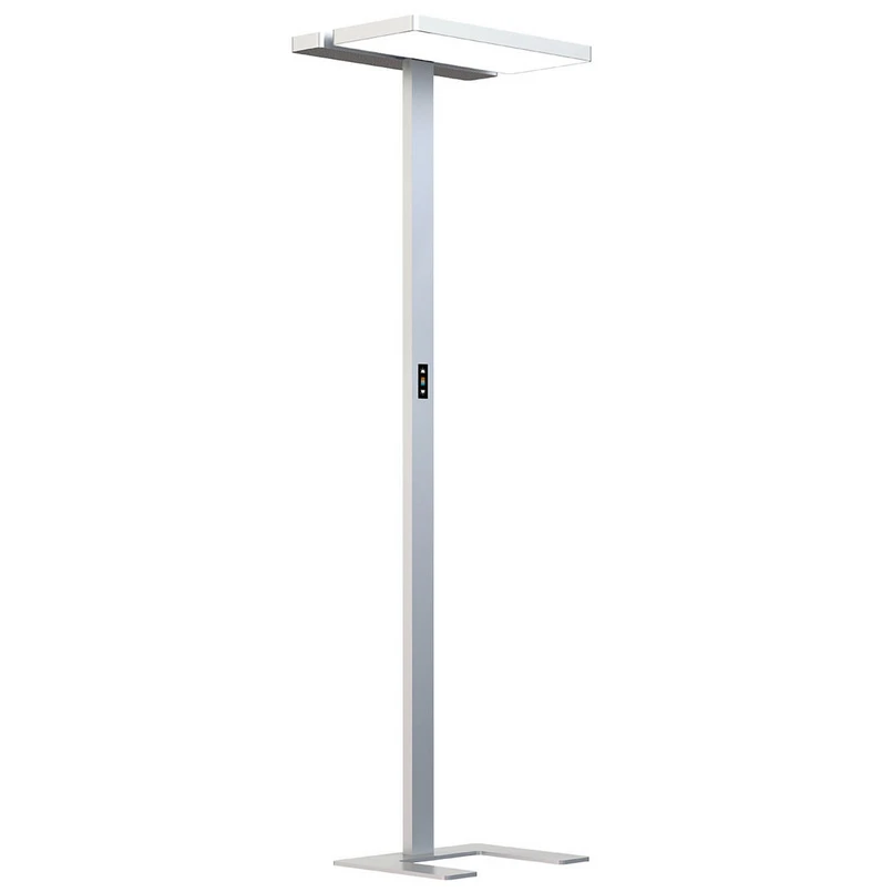 Aila Gulvlampe Silver/White er et sandt multitalent, når det gælder belysning af arbejdsrum. Lampen har en praktisk form sammensat af en U-formet fod, der gør den nem at manøvrere omkring skrivebordsben, et stel på næsten 2 meter, der sikrer lampehovedet imod at stå i vejen, og et bredt lampehoved, der giver et godt lysindfald. LED’erne skinner både ud fra bunden og toppen i et kombineret direkte og indirekte skær.