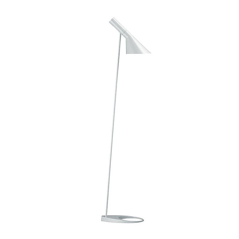 AJ gulv i hvid har et armaturhoved med en karakteristisk asymmetrisk form, som er bestemmende for armaturets lysegenskaber. Armaturhovedet på AJ gulvlampen kan vippes op og ned. Med sit unikke formsprog fremstår armaturet som en moderne klassiker.