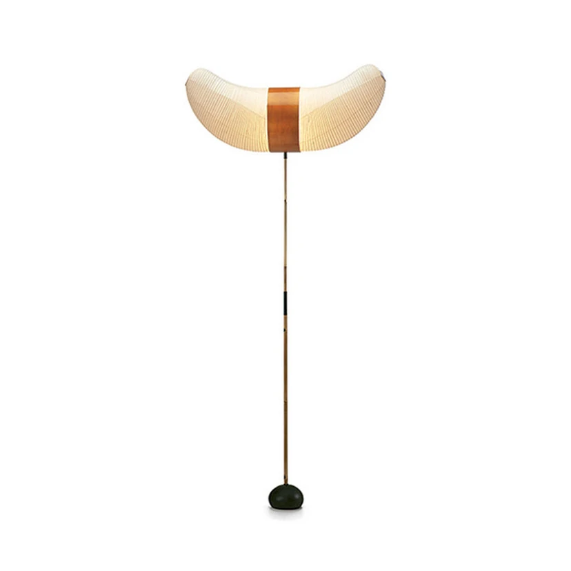 De skulpturelle gulvlamper kombinerer det skandinaviske look med traditionelt håndværk. Anvend dem til at oplyse et af hjemmets mørke kroge eller som et dekorativt element i indretningen. Lampens spinkle ben bakker op om lampens lette udtryk, og giver samtidig en moderne kontrast til den velkendte skærm af rispapir.