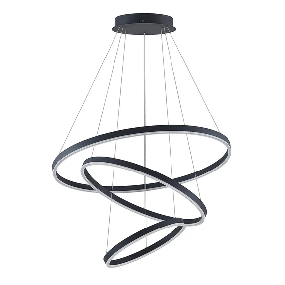 Hver cirkel har en lækker sort overfladefinish med et bånd af LED-lys, der løber langs undersiden. Lyskilderne er skærmet af et hvidt dæksel, så lyset fremstår særdeles blødt og homogent. Når lampen tændes, lyser hele strukturen op i et smukt varmhvidt skær, der effektivt oplyser området under lampen. Lampen kan med fordel monteres over områder med brug for direkte belysning, eks. spiseborde eller sofaborde, hvor man samtidig kan have glæde af det elegante og stilfulde design.