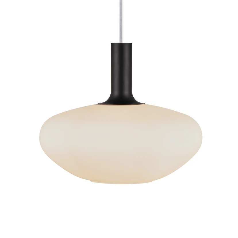 Skærmens mathvide overflade sikrer, at lyset kan trænge ud til alle sider i et blødt og behageligt skær, der ikke blænder. Lampen er udstyret med en E27-fatning, der passer til en lang række forskellige pæremodeller.