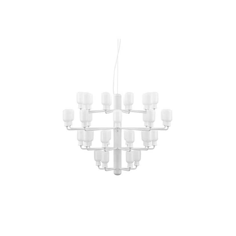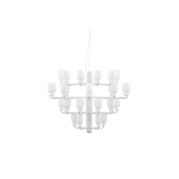 Amp Chandelier Large White er designet med tankerne på en gammel rørforstærker fra en radio. Formen fra den eksisterende pendlen og bordlampen i samme serie, er videreført til denne showstopper af en lysekrone. Den er bygget op omkring en søjle med små arme, som hver holder en miniature af bordlampen.