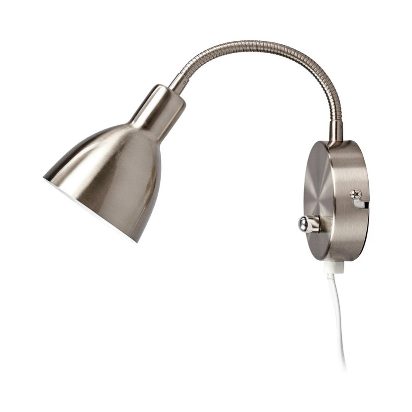 Amrei Væglampe Nickel er en fleksibel lysmodel, hvor funktionaliteten er i top. Lampens stel har en fleksarm monteret, der gør det muligt at justere lysets retning i alle tænkelige retninger, så man kan indstille lysvinklen med stor præcision. Kontakten til at betjene lampen sidder monteret direkte på vægbeslaget, hvilket gør betjeningen hurtig og nem at tilgå. Af denne grund kan Amrei med fordel monteres ved senge, sofaer eller i andre siddeområder. Kontakten har også en indbygget dæmpningsfunktion. Ved at dreje på knappen kan man derfor skrue lysstyrken op eller ned alt efter tidspunkt og behov.
