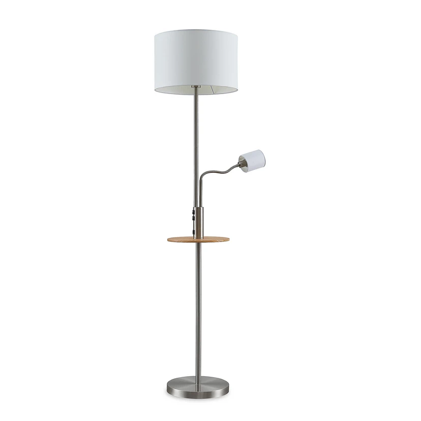 Aovan Gulvlampe w/USB Nickel er en glimrende tilføjelse til stuen ved sofaen eller læsehjørnet med sit praktiske lys og mange funktioner. Lampen har to lyskilder. Den ene sidder i toppen som en klassisk gulvlampe, er betrukket med hvidt tekstil og har en cylindrisk form, der muliggør en kombineret direkte og indirekte belysning. Den anden sidder midt på stellet og er monteret til en fleksarm, så lysretningen kan justeres. Denne lyskilde har også en stofskærm, der matcher den anden i både form og farve for en flot sammenhæng i det overordnede design. Via to kontakter på stellet kan lyskilderne betjenes uafhængigt af hinanden.