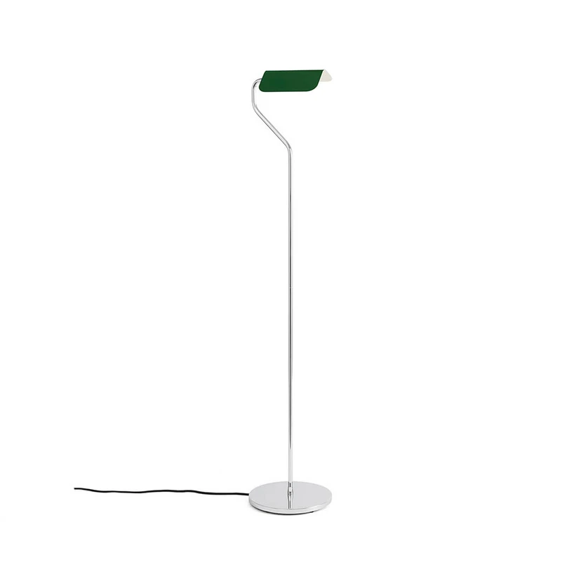 Apex Gulvlampe Emerald Green fra HAY er en moderne fortolkning af den klassiske banklampe, designet af britiske John Tree. Denne gulvlampe kombinerer traditionelle elementer med en moderne, farverig æstetik. Den foldede stålskærm skaber en karakteristisk silhuet, der står i grafisk kontrast til den krombelagte base. Med en rund base og en lang, slank stamme, tilbyder lampen en 360 graders roterbar skærm, så du kan justere lyset efter dine behov.