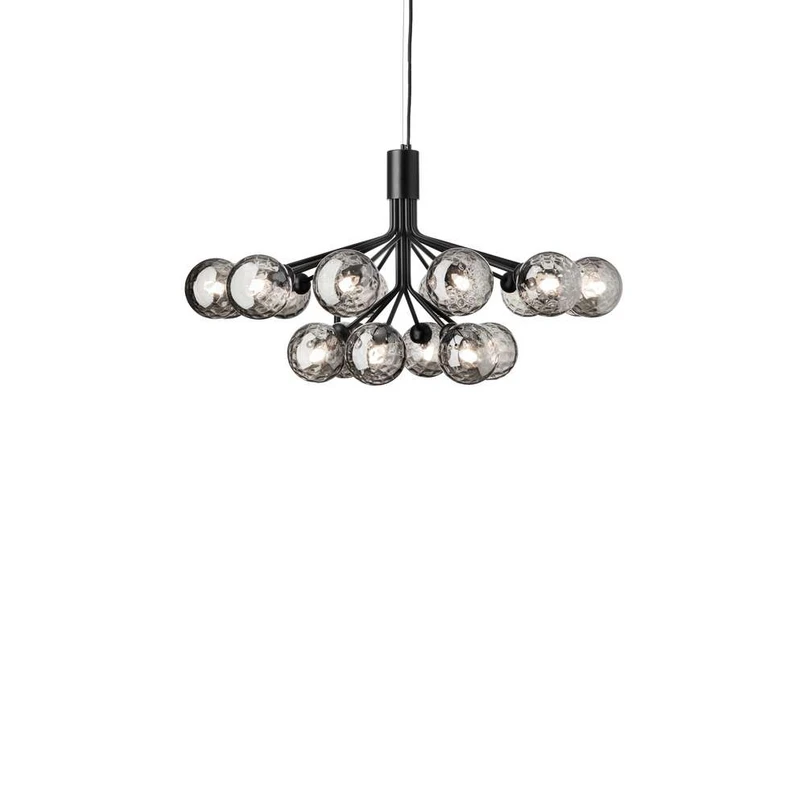 Apiales 18 Chandelier Satin Black/Optic Smoked er designet Sofie Refer, som har hentet inspiration fra den blomst, vi bedst kender herhjemme som en bjørneklo. Den er designet til at fange opmærksomheden fra enhver, som træder ind i lokalet.