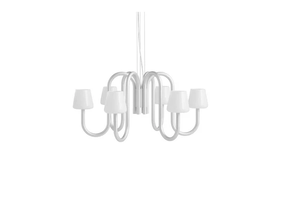 Apollo Alu/White Opal 745 Lysekrone præsenterer sig i et moderne og elegant design med enkle former, svungne buer og en minimalistisk ynde i hele sit udtryk. Lampen er en del af en serie bestående af flere typer bordlamper, væglamper og lysekroner i forskellige størrelser.