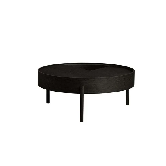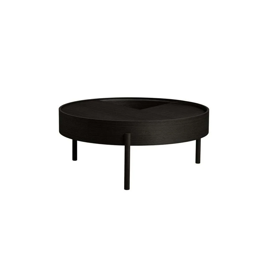 Arc Coffee Table Ø89 Black Ash fra Woud er det perfekte valg til dig, der søger et stilfuldt og funktionelt bord til dit hjem. Dette elegante sidebord er fremstillet af sort malet askfinér med ben i massiv ask, hvilket giver det et tidløst og moderne udtryk. Bordets unikke design er inspireret af det matematiske koncept med en blød kurve, der forbinder to punkter i en cirkel. Med en enkel drejning kan du ændre bordets udseende fra en fuldt funktionel overflade til et grafisk element, der afslører det smarte opbevaringsrum nedenunder. Brug det til at fremvise dine yndlingsgenstande, eller hold det lukket for at gemme hverdagens småting af vejen. Arc Coffee Table er ikke kun et praktisk møbel, men også en æstetisk tilføjelse til enhver stue eller opholdsrum.