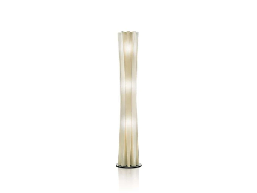 Bach Gulvlampe XL Gylden fanger straks øjet med sin imposante søjlestruktur, der giver lampen et monumentalt udseende og gør den til et ægte statement i indretningen. Lampen er designet af Francesco Paretti for italienske SLAMP og fremstillet af Opalflex, der ud over sine varmeregulerende egenskaber og behagelige lysspredning er et signaturmateriale for den italienske lysvirksomhed. Lampekrop og lampeskærm går ud i et i denne model, der udgøres af et regulært lyslegeme, som afgiver en blød belysning hele vejen rundt om lampen. Lyspærerne indeni skaber smukke lyspunkter og et gradueret lys i mellemrummene. Da hele lampen lyser op, fremhæves det flotte søjledesign, hver gang lampen er tændt.