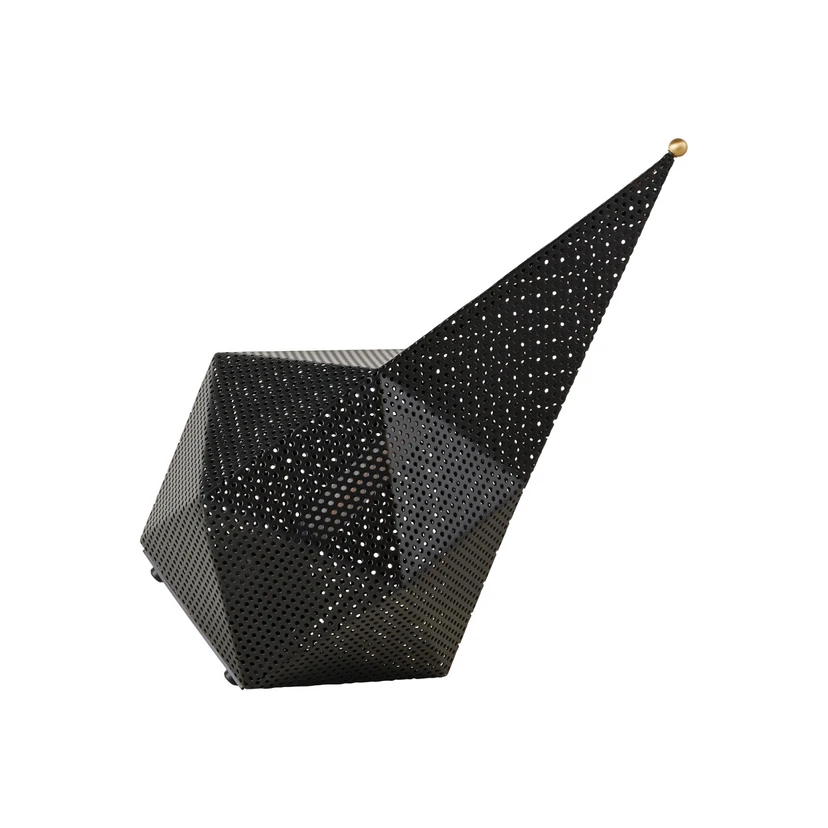 Lampen er lavet af metal og har en sort, semi-mat finish, der er UV-resistent og beskyttet mod elektriske komponenter, hvilket gør den velegnet til udendørs brug, hvis den holdes tør. Den lille messingkugle på toppen fungerer som en touch-aktiveret dæmper, hvilket gør det nemt at justere lysstyrken. Bagdad Lampens geometriske form og perforerede skærm skaber en smuk, atmosfærisk lyseffekt, der tilføjer visuel interesse til ethvert rum.