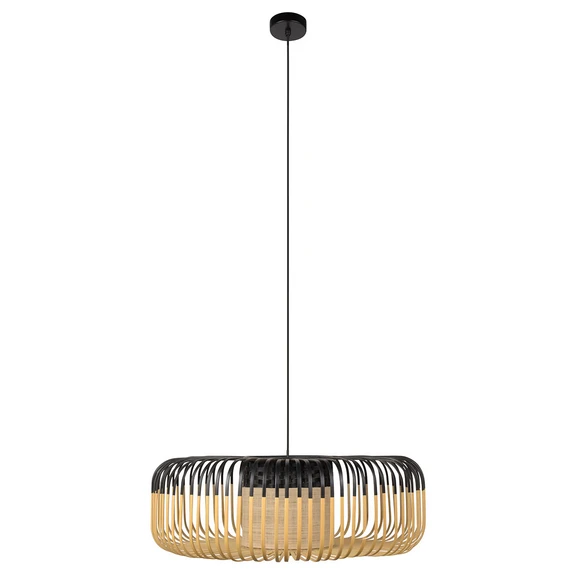 Bamboo Pendel XL Black er en herlig forening af naturlige materialer med moderne design. Lampens skærm består af et symmetrisk netværk af bambusstivere, der giver en lys og luftig fornemmelse. Arrangementet af stiverne skaber sarte skygger på væggen, når lyset tændes, samtidig med, at de giver direkte udsyn til lampens ”interiør”: en cylindrisk diffuser af flettet og vævet bambus.
