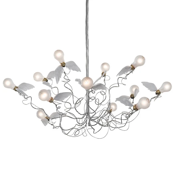 Birdie LED Pendel Transparent er en spændende lampe fra tyske Ingo Maurer. De ikoniske vinger, der er placeret på hver fatning, er lavet af gåsefjer og giver fornemmelsen af, at hver enkelt pære er i færd med at flyve væk. En lampe med et dynamisk og skulpturelt design, der med garanti skaber et flot blikfang i indretningen. Lampen er dæmpbar, så ønsker du mulighed for at dæmpe lysstyrken, kan den anvendes sammen med en ekstern dæmper.