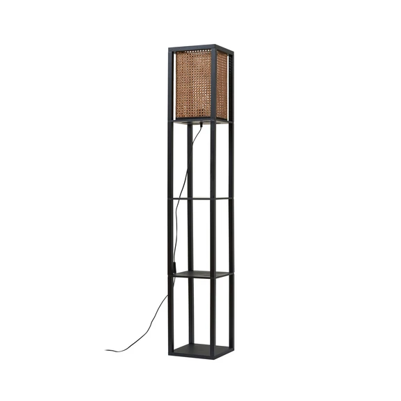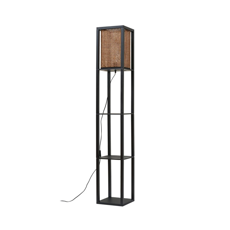 Kantet gulvlampe Birta – dekorativt reol-design med rattan-skærm