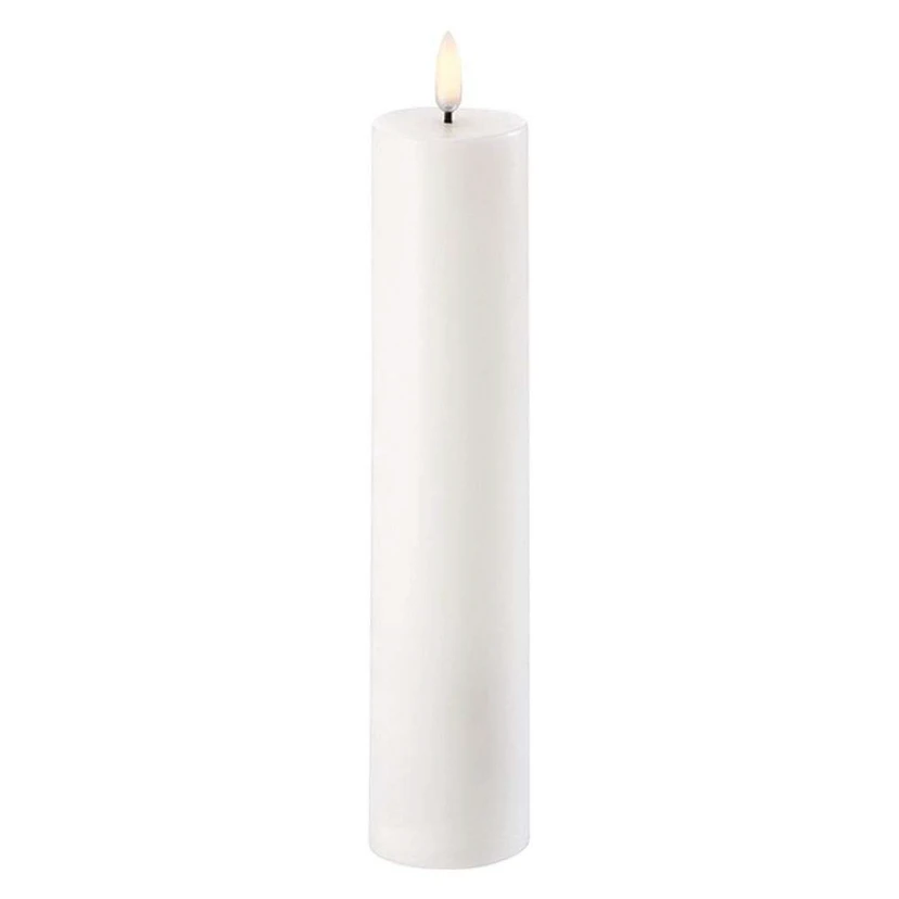 Bloklys LED Nordic White 4,8 x 22 cm har en unik 3D flamme, der til forveksling ligner flammen fra et traditionelt stearinlys. Takket være LED-teknologien, har Uyuni Lighting skabt en serie af LED-stearinlys, der ligner en levende flamme, som står og blafrer let. Flammen har ingen fysisk bevægelse, og du slipper derved for at bruge strøm på at holde bevægelsen i gang.