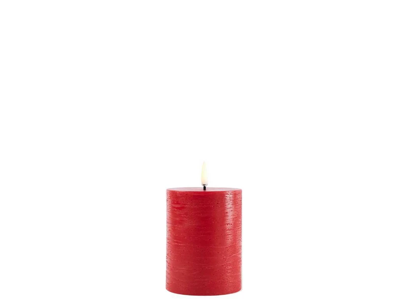 Bloklys LED 7,8x10,1 cm Rustic Red har en unik 3D-flamme, der til forveksling ligner flammen fra et traditionelt stearinlys. Takket være LED-teknologien, har Uyuni Lighting skabt en serie af LED-stearinlys, der ligner en levende flamme, som står og blafrer let. Flammen har ingen fysisk bevægelse, og du slipper derved for at bruge strøm på at holde bevægelsen i gang.
