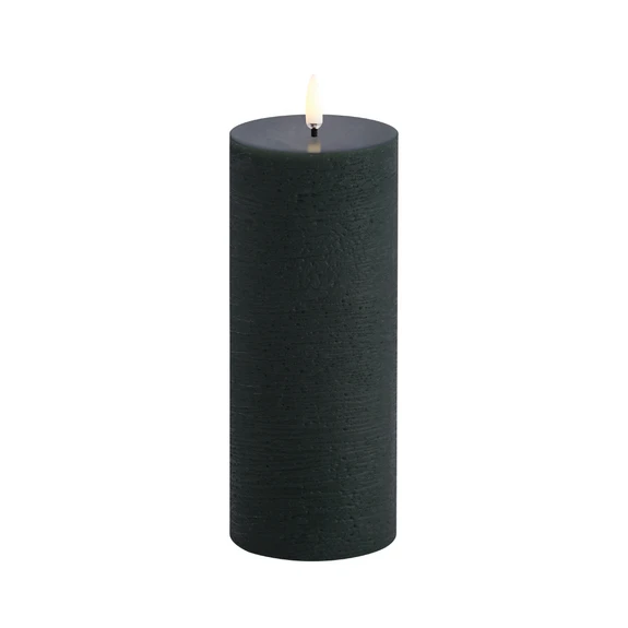 Bloklys LED 7,8x20,3 cm Pine Grøn/Rustic fra Uyuni Lighting er det perfekte valg til dig, der ønsker at skabe en hyggelig og sikker atmosfære i dit hjem. Dette grønne bloklys, fremstillet af jomfru paraffinvoks, kombinerer traditionelt design med moderne teknologi. Med en højde på 10 cm og en diameter på 8,4 cm passer det perfekt ind i enhver indretning. Uyuni® LED lys er kendt for deres innovative 3D flamme, der giver et realistisk og blidt skær uden risikoen for åben ild. De er både lugtfrie og batteridrevne, hvilket gør dem til et sundere alternativ til traditionelle stearinlys. Du kan nemt styre lyset med en fjernbetjening eller bruge timerfunktionen, der kan indstilles fra 4 til 10 timer, så du kan tilpasse lyset til enhver lejlighed. Skab en afslappende stemning med et enkelt tryk og nyd den praktiske fjernbetjening, der gør det muligt at justere lysstyrken fra hvor som helst i rummet.