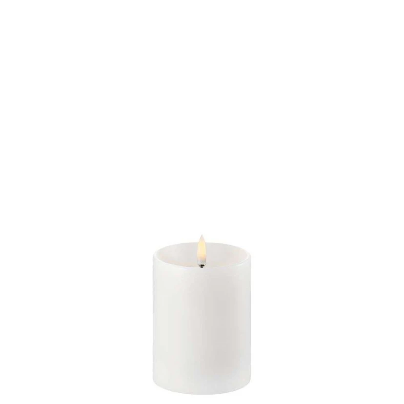 Bloklys LED w/shoulder Nordic White 7,8 x 10 cm har en unik 3D-flamme, der til forveksling ligner flammen fra et traditionelt stearinlys. Takket være LED-teknologien, har Uyuni Lighting skabt en serie af LED-stearinlys, der ligner en levende flamme, som står og blafrer let. Flammen har ingen fysisk bevægelse, og du slipper derved for at bruge strøm på at holde bevægelsen i gang.