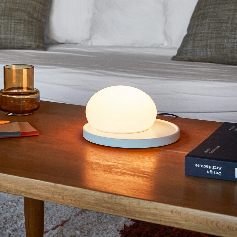 Basen består af en rund falde, hvorpå der er anbragt en rund skærm af mundblæst opalglas. Den indbyggede LED-kilde giver lampen et blødt og behageligt lys, og med en diameter på blot 18 cm. passer den perfekt i vindueskarmen, på natbordet eller på den lille kommode.