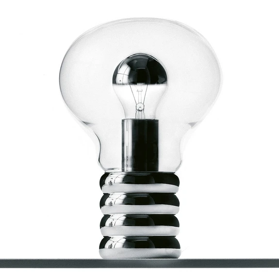 Bulb Bordlampen fra Ingo Maurer er helt tilbage fra 1966, men den er den dag i dag stadig en frisk og anderledes lampe med sin tegneserieagtige fremtoning. Foden, der er formet som soklen på en klassisk glødepære, er lavet af forkromet metal der er poleret op. Selve skærmen, der så er formet som en glødpæres glas, er i det fineste mundblæste krystalglas fra Murano.