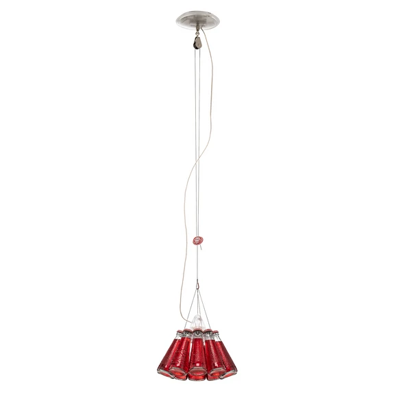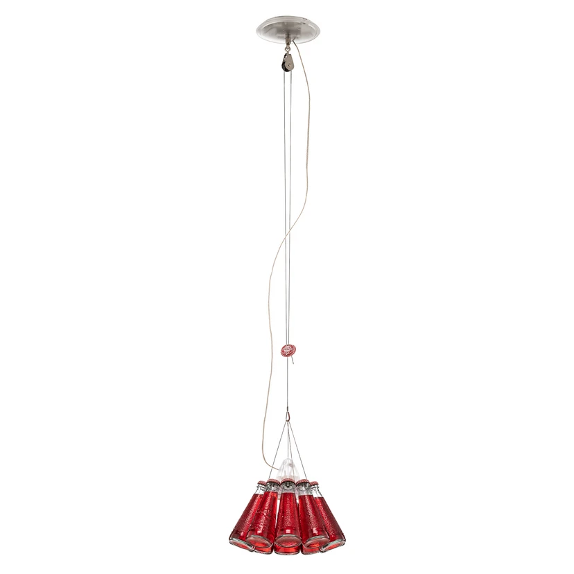 Campari Light 155cm Pendel fra Ingo Maurer er en unik og iøjnefaldende pendel lampe, der bringer et strejf af italiensk charme ind i dit hjem. Denne pendel er skabt med ti originale Campari Soda flasker, som hver især kan tages af, hvilket giver dig mulighed for at tilpasse udseendet efter dine ønsker. Fremstillet af metal og plast, kombinerer denne lampe holdbarhed med et moderne design. Den røde farve tilføjer en livlig og varm atmosfære til ethvert rum, mens den justerbare højde via Campari kronkapslen gør det nemt at tilpasse belysningen til dine behov. Vær opmærksom på, at flaskerne indeholder alkohol, hvilket gør denne lampe til en samtalestarter i ethvert hjem.