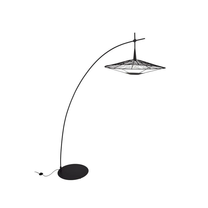 Carpa Gulvlampe Black fra franske Forestier og tyske Jette Scheib er en elegant lampe, der i en næsten matematisk matrix-mønster tydeliggør sin geometriske form gennem polygoner optegnet i tynde strenge. Lampen er dermed gennemsigtig, og på den måde formår Scheib at skabe luftig belysning der elegant i lokalet lader lyset undslippe sin form.