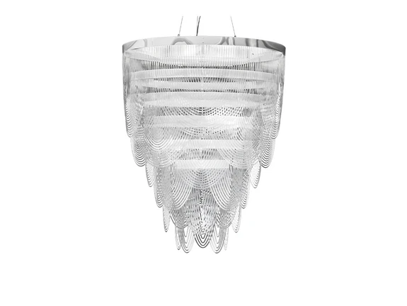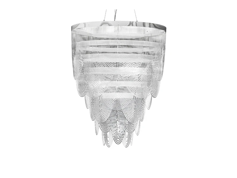 Ceremony Pendel L Prisme fra SLAMP er en pendellampe, der kombinerer elegance og lethed i et imponerende design. Denne opulente lampe, skabt af Bruno Rainaldi, er en hyldest til femininitet og minder om en svajende nederdel, en perlehalskæde og elegante draperinger. Med sine fem lyskilder, der er fordelt over teknopolymer halskæder, skaber den en dramatisk effekt, der samtidig føles let og luftig. Lampens materiale, Cristalflex® i en smuk Fumé-sølvfarve, tilføjer et strejf af luksus og raffinement til ethvert rum. Den store størrelse gør den ideel som et centralt element i stuen, spisestuen eller entréen, hvor den kan tiltrække opmærksomhed og skabe en varm atmosfære. Ceremony pendlen er ikke blot en lyskilde, men et kunstværk, der beriger dit hjem med stil og elegance.