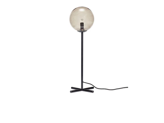 Champ Bordlampe Black/smoke er en flot lampe i et originalt design, der lyser op i indretningen og tilføjer et personligt præg til hjemmets interiør. Særligt lampens formsprog springer i øjnene: den krydsformede fod og det slanke stel danner kontrast til den voluminøse, kuglerunde glasskærm i toppen, der smukt imiterer formen på en pære, hvilket skaber en smuk dobbelteffekt med pæren indeni.