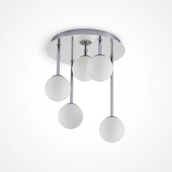 Chrissy 5 Loftlampe Ø25 Opal/Chrome er karakteriseret ved et moderne, dekorativt design, der bidrager til at give rummet et æstetisk løft. Lampens fem lyskilder er alle omsluttet af kuglerunde opalskærme og kunstfærdigt arrangeret i en asymmetrisk klynge nær loftbeslaget. Hver lyskilde er forbundet beslaget via et slankt stel, der giver dem en helt særlig dråbe-lignende æstetik.