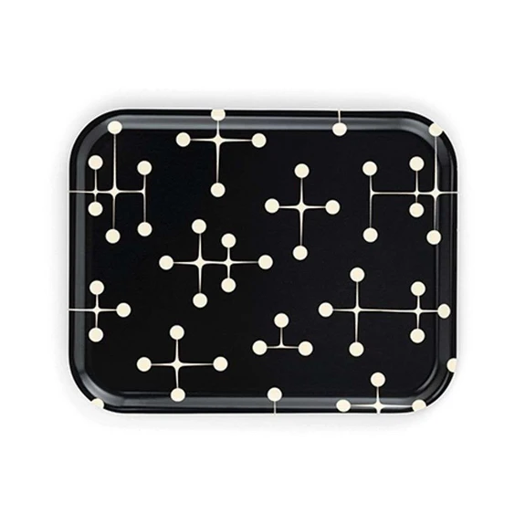 Classic Tray Large Dot Pattern Reverse Dark er traditionel serveringsbakke i krydsfiner. Bakken er lamineret med et dekorativt motiv, der pynter når den står på sin plads, men også ser smuk ud i brug – eksempelvis når morgenkaffen skal serveres eller nydes på terrassen. Den forhøjede kant omkring bakken giver et godt greb når bakken skal flyttes og sikrer samtidig, at tingene falder af.