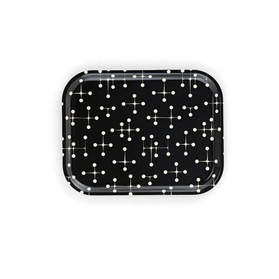 Classic Tray Medium Dot Pattern Reverse Dark er traditionel serveringsbakke i krydsfiner. Bakken er lamineret med et dekorativt motiv, der pynter når den står på sin plads, men også ser smuk ud i brug – eksempelvis når morgenkaffen skal serveres eller nydes på terrassen. Den forhøjede kant omkring bakken giver et godt greb når bakken skal flyttes og sikrer samtidig, at tingene falder af.