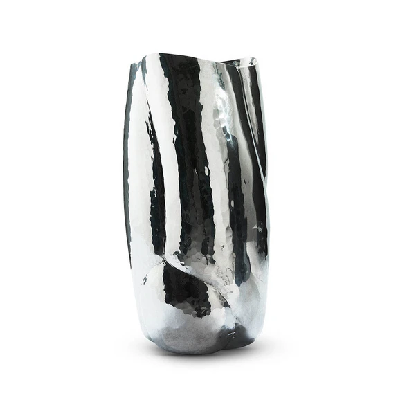 Cloud Vessel Vase Silver - Tom Dixon er en imponerende tilføjelse til dit boligtilbehør. Denne vase fra det anerkendte mærke Tom Dixon er en del af Cloud-kollektionen, der består af skulpturelle stykker fremstillet af højt reflekterende poleret aluminium. Med en højde på 43,5 cm og en diameter på 21,5 cm er denne sølvfarvede vase både elegant og funktionel. Håndlavet af dygtige håndværkere i Indien, er hver Cloud-vase unik og skaber et stærkt visuelt indtryk i ethvert rum. Vasen er vandtæt, hvilket gør den ideel til blomsterarrangementer, men den er også sikker til opbevaring af tørre fødevarer. Uanset om du placerer den i stuen, køkkenet eller entréen, vil denne vase tilføje et strejf af moderne elegance til dit hjem.