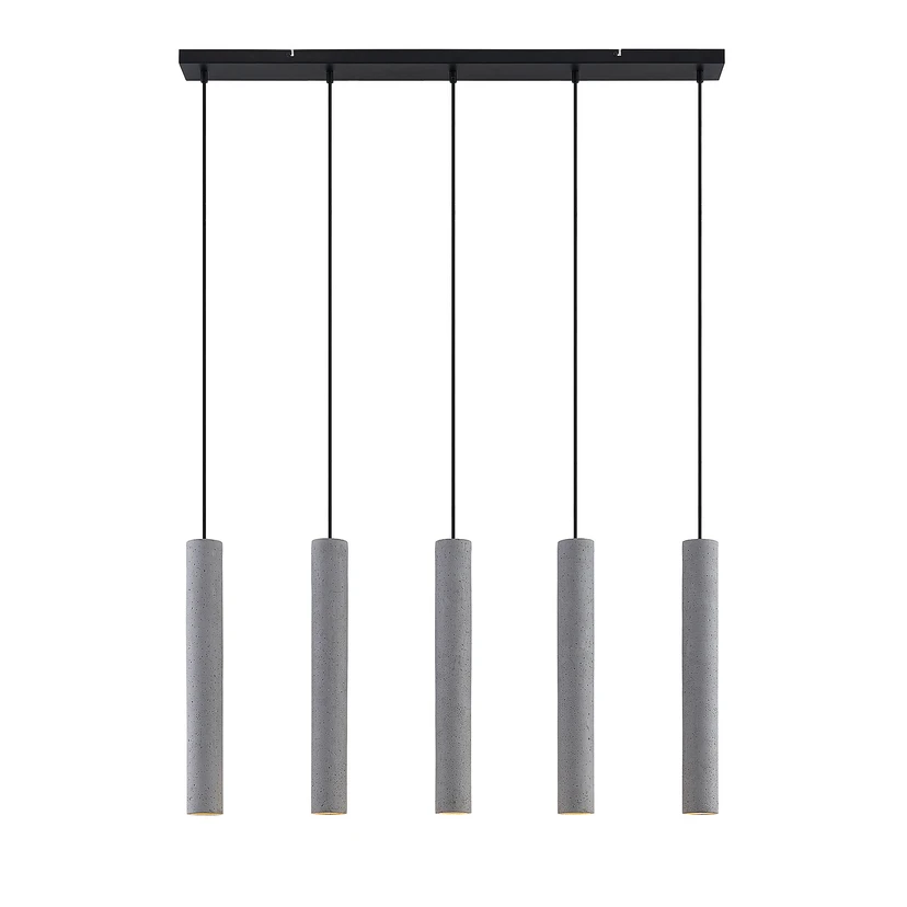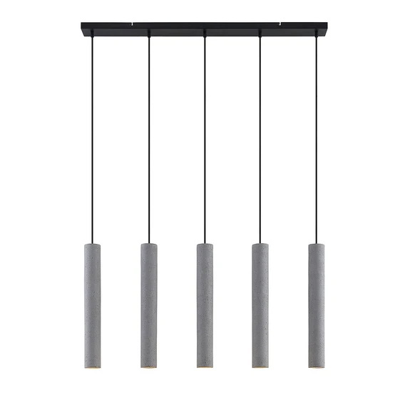 Concretto 5 Pendel Concrete præsenterer sig i et slankt, selvsikkert design, der forbliver enkelt i sit udtryk men som samtidig beriger indretningen med en stilfuld æstetik. Lampen har fem matchende lampehoveder, der er fremstillet af beton med en cylindrisk form og en smal lysudgang for enden, der udsender en fokuseret belysning. GU10-fatningerne er placeret et stykke inde i lampehovedet, så lyset ikke blænder. Med en længde på lige akkurat 1 meter afgiver lampen en bred belysning og er derfor velegnet at montere over aflange overflader med behov for et direkte skær, det være sig spisebordet, køkkendisken eller skranken. Lyskilderne hænger i fuldkommen ens højde, hvilket skaber en fornemmelse af ro og balance. Imidlertid kan kabellængden på de enkelte skærme også forkortes under monteringen, så man kan tilpasse lampedesignet og det overordnede lysbillede til sin egen smag, eksempelvis ved en gradvis trappeeffekt.