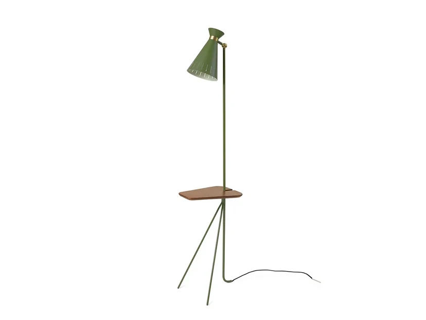 Cone Gulvlampe m/Bord Pine Green er en skøn og designorienteret lampeserie, hvis historie går helt tilbage til 1954, da den internationalt anerkendte lysdesigner Svend Aage Holm-Sørensen tegnede lampen og dermed skabte en klassiker. Lampeserien er kendetegnet ved en kegleformet skærm, der har givet ophav til seriens navn. Skærmen er af metal med en eksklusiv silkemat farve, der er et særkende for Warm Nordic og en karakteristisk ring af massivt messing, der giver indtryk af at holde skærmen sammen, og som tilføjer et smukt klassisk strejf til den overordnede helhed. Skærmens rand er forsynet med lyshuller, som bidrager smukt til den overordnede lysvirkning.