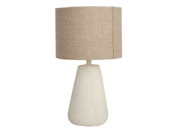 Cora Bordlampe White/Natural er en leg med former og materialer, der forvandler sig til et inspirerende designelement, som lyser dit hjem op. Den hvide lampefod er fremstillet af metal og omhyggeligt indhyllet i bæredygtigt papmaché, som giver overfladen en ru tekstur. Foden har en ubrudt dråbeform og er parret med en cylinderskærm i naturfarvet linned, som tilføjer et naturligt præg til det overordnede design.
