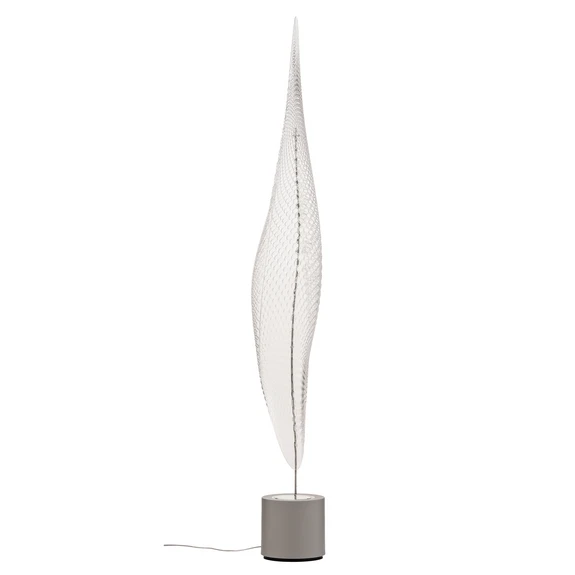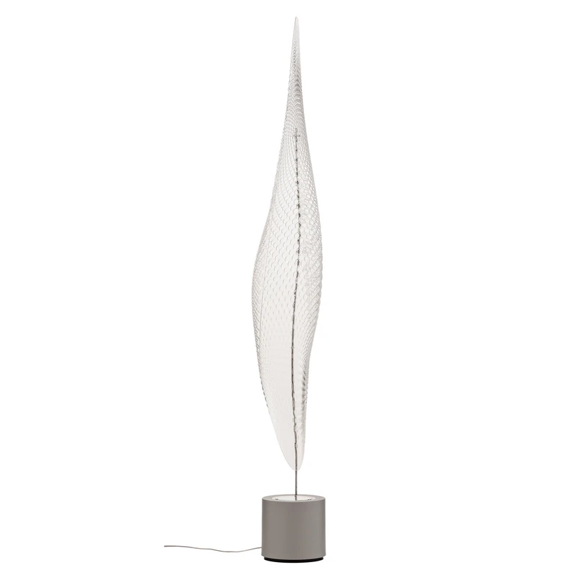 Cosmic Leaf Gulvlampen svæver elegant som et digitaliseret æterisk blad ud af en anden verden. Overfladen fremstår intrigant i sin overflade og leder tankerne hen mod skæl fra et krybdyr eller et insekts panser, der samler lys og skygge på sin krop under dansen for at forføre en mage.