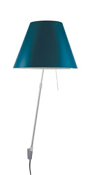 Costanza Væglampe m/dimmer Alu/ Petroleum Blue er nu fyldt 25 år plus det løse, så der skulle friske skærme og nye farver til kroppen. Costanza blev designet i 1986 af Paolo Rizzatto for Luceplan, og har levet gennem forskellige stilarter og tidsaldre uden at blive ændret i sin grundform. Costanza er stadig elegant og tidløs.