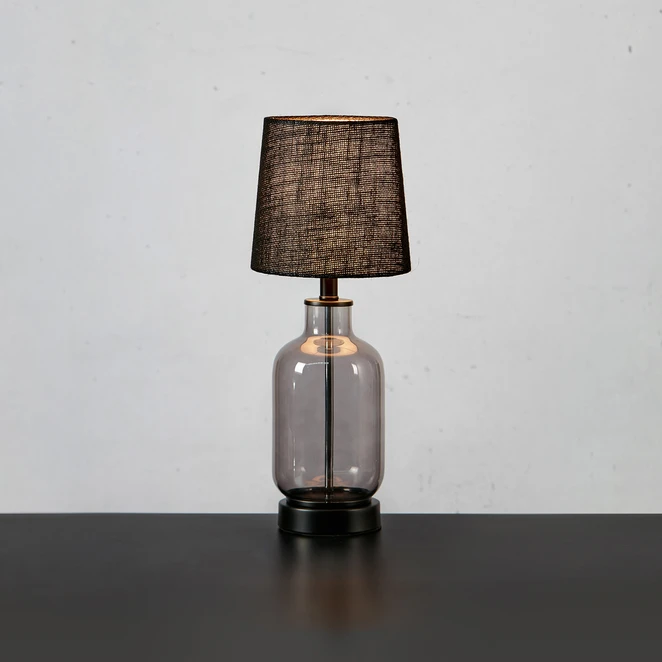 Costero Bordlampe H43 Smoke/Black kombinerer rustik og klassisk stil – med et smukt og elegant resultat. Den traditionelle cylindriske tekstilskærm, slanke stel og solide, runde fod er her blevet forenet med en skøn flaskeformet glasstruktur, der får lampen til at minde om en blomst i en vase. Denne dekorative effekt gør bordlampen til en æstetisk tilføjelse til indretningen, såvel som en praktisk ekstra belysning i rummet. Skærmen er af vævet jute, hvis ru og grove overflade tilfører et taktilt element til lampens design og smukt fremhæver til dens rustikke undertoner.