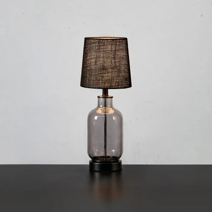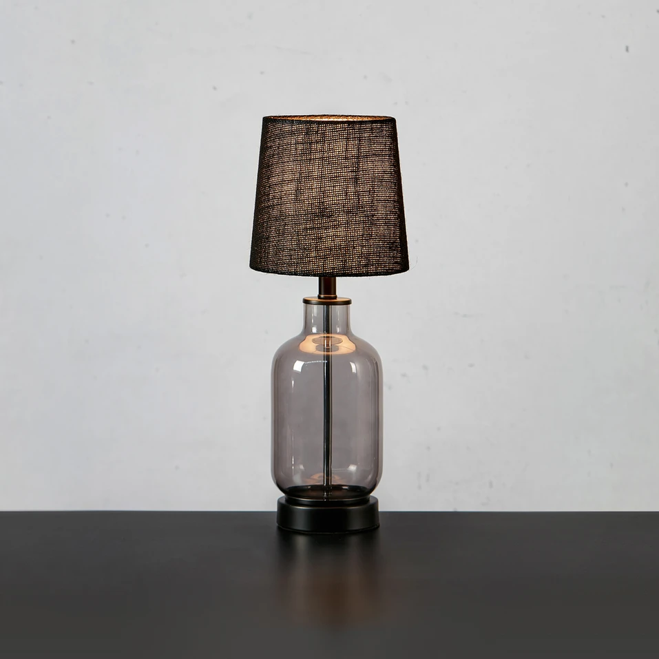 Costero Bordlampe kommer i to flotte udgaver. Den ene har en naturfarvet skærm og transparent glasstel, der giver den et afslappet look, mens den anden har en sort skærm og et røgfarvet glas for en mere moderne, kølig tone. Hver variant kommer i to forskellige størrelser.