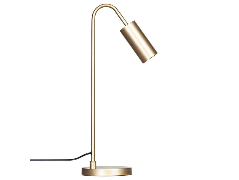 Curve Bordlampe Matt Gold er en alsidig lampemodel med et klart og enkelt design, der både tilfører et stilrent og moderne look til udseendet og samtidig gør lampen nem at integrere i mange forskellige rumtyper, private såvel som offentlige, kommercielle og erhvervsrelaterede lokaler. Lyset skinner direkte ud gennem en åbning i det cylindriske lampehoved. Dette giver en direkte og fokuseret belysning, der er ideel til at fremhæve bestemte dele af rummet eller som læselys.