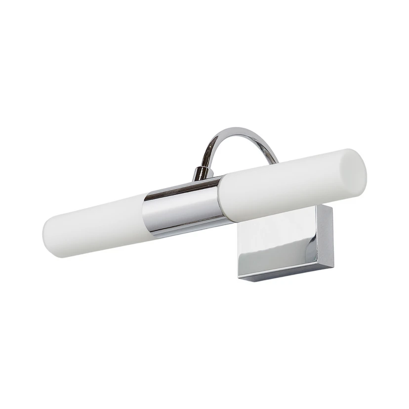 Devran Væglampe Chrome har en lækker moderne udstråling, hvor kombinationen af klare metal farver og sarte hvide glas skærme skaber en flot harmoni med langt de fleste badeværelsers armatur. Den buede lampehals gør den oplagt til en plads over spejlet, hvorfra det blide og behagelige lys udgår mildt og behageligt gennem de satinerede glasskærme.