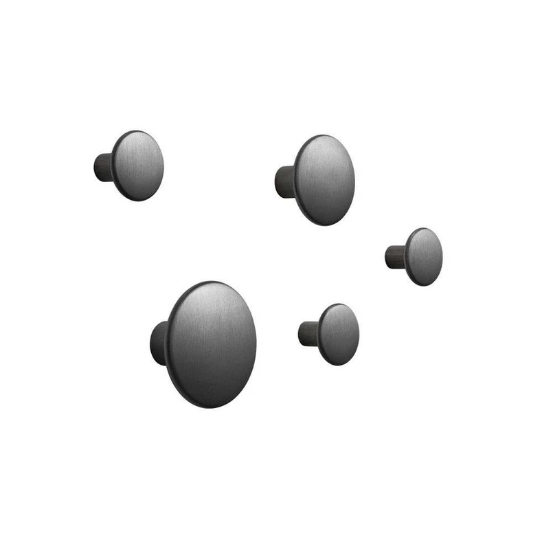 Dots Metal Set Of 5 Black er en legesyg fortolkning af den klassiske knage. Her får du et sæt med 5 hvor du kan skabe dit helt eget udtryk. Anvend Dots i entreen, soveværelset, badeværelset – eller hvor du nu har behov for at hænge noget på knager.