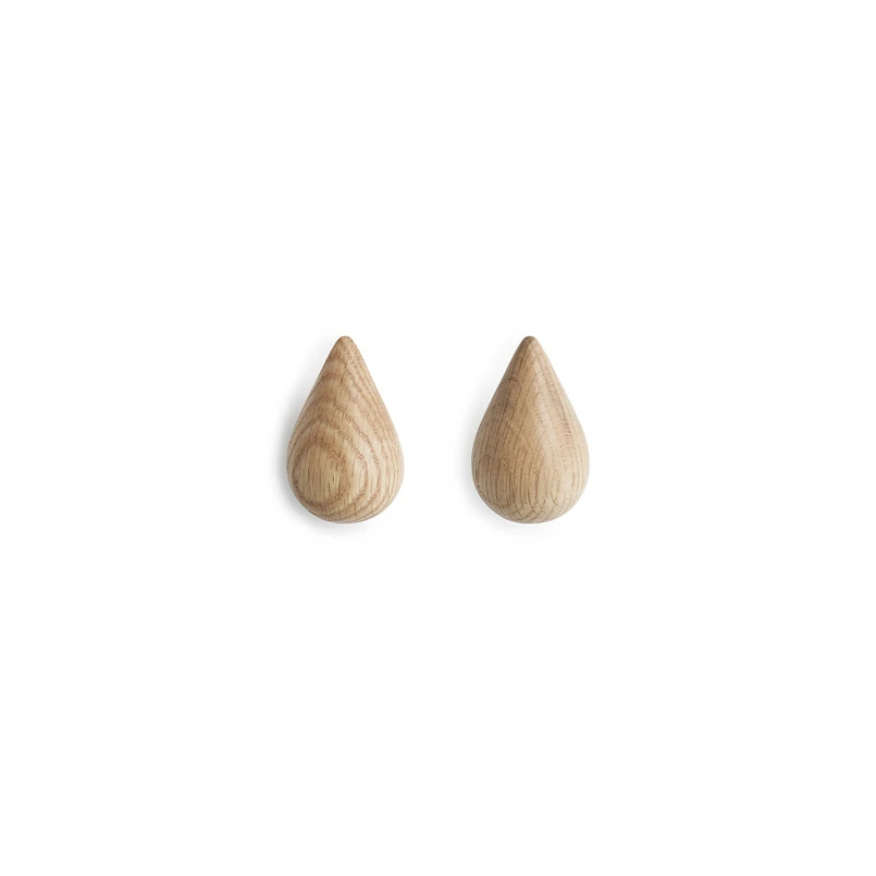 Dropit Hooks Small 2 pcs. Oak er et interessant, elegant og originalt design, som skaber et stærkt visuelt udtryk i indretningen. De dråbeformede knager i træ har mere end bare en praktisk funktion i hjemmet, da de i den grad også fungere som et dekorativt indretningselement, da de minder om kunstværker på væggen. Her kan du både placere en enkelt dråbe for sig eller med fordel flere i sammen med hinanden, for at skabe et nydeligt mønster – det er kun fantasien, der sætter grænser for dette design, der har utallige opstillingsmuligheder. På den måde kan du skabe en unik væg af regn med de dråbeformede knager, som du desuden kan få i forskellige størrelser og farver, så du kan få præcis de modeller, der passer bedst til din indretning.