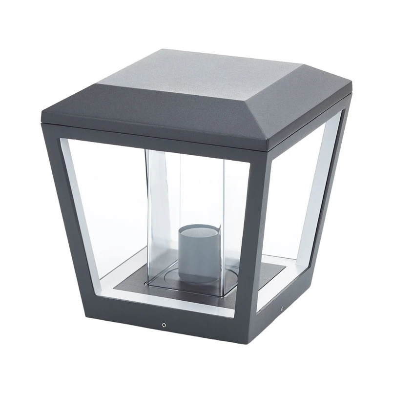 Dunia Udendørs Havelampe Dark Grey er en elegant tilføjelse til belysningen af udendørsarealerne. Lampen er primært fremstillet af aluminium og har en firkantet grundform med let afrundede kanter, der giver omgivelserne et strejf af modernitet og stilfuldhed. Lampen kunne næsten minde om en lille montre, der giver frit udsyn til den inderste pære, der udgør lampens ”udstilling”. Da pæren er fuldt synlig, kan vi anbefale, at man vælger en dekorativ pære til dette formål.