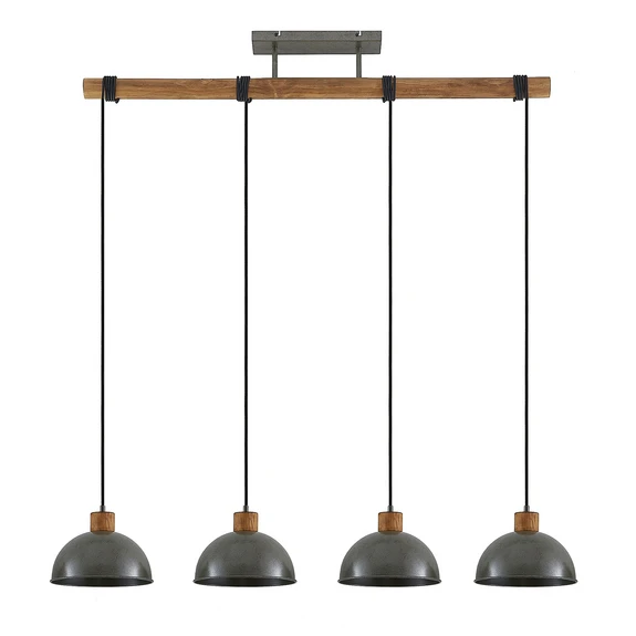 Durbis 4 Pendel Dark Grey/Wood kombinerer industristil med moderne æstetik i en skøn forening, der nemt passer ind i indretningen takket være sin enkle udformning og neutrale farvesammensætning. Lampen har et forholdsvis bastant udtryk, der skyldes de robuste materialer, som indgår i designet, da foreningen af træ og jern giver lampen en flot tyngde og et solidt udseende. Stellet består af en tværstang af træ, der holder kablerne til hver skærm. Kablerne kan vikles flere eller færre gange rundt om tværstangen, så man dermed kan bestemme højden på hver enkelt lyskilde. Her kan man eksempelvis lade alle lamper hænge i samme højde for et afbalanceret udtryk eller variere dem skiftevis eller i en dekorativ trappeformation.