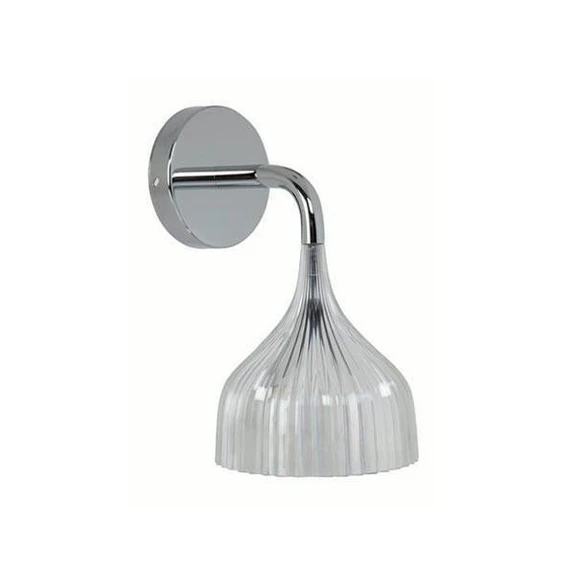 E’ pendlen har en lampeskærm i plisseret polycarbonat, roset i krom og en medfølgende ledning der kan justeres fra 20 cm. til 220 cm. -E’ væglampen har ligeledes en skærm i plisseret polycarbonat, der fås i alle farverne -og har en afslutning imod væggen i krom.
